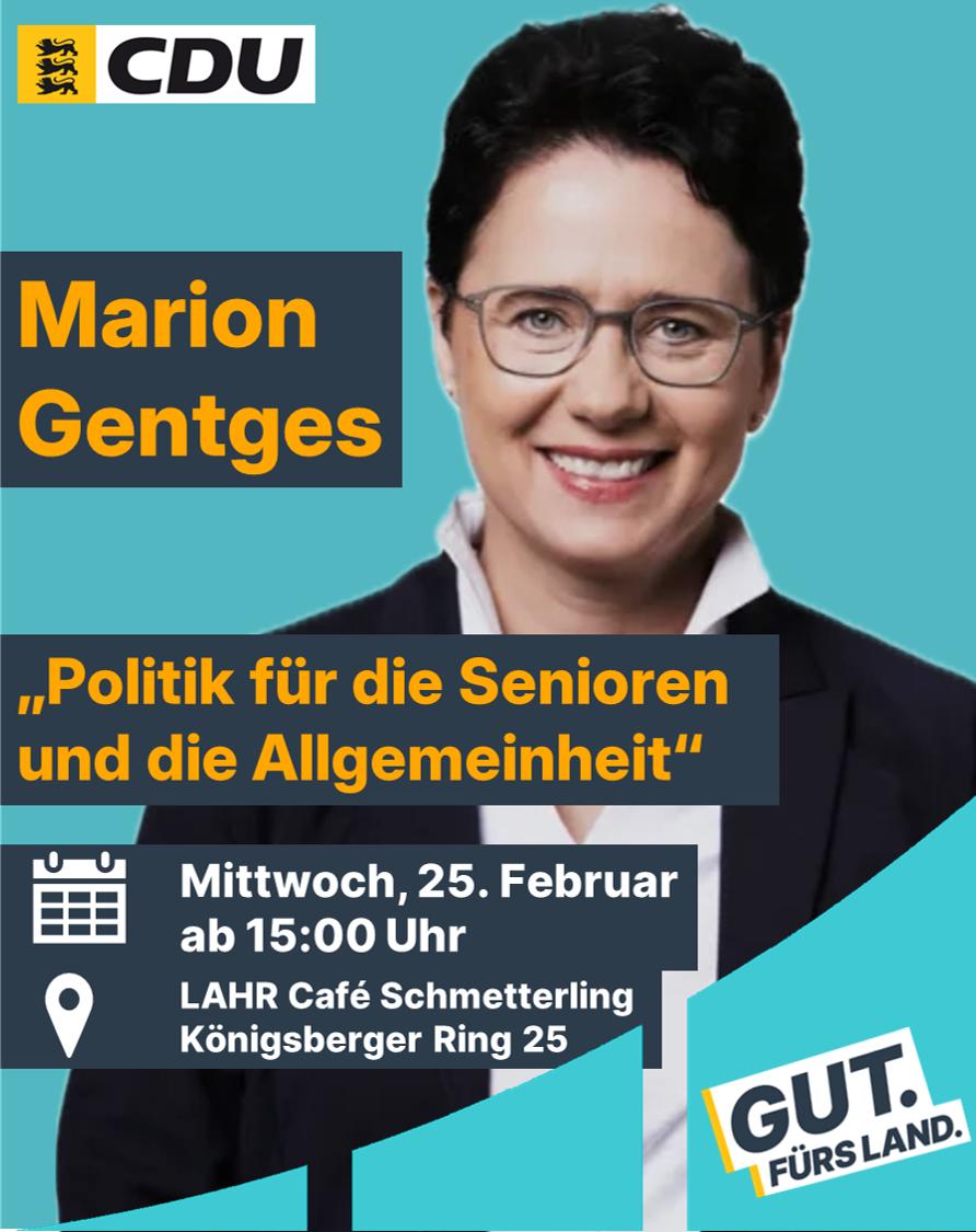 Unter dem Motto “Politik für die Senioren und die Allgemeinheit” stellt sich Justizministerin Marion Gentges, MdL persönlich vor und wird Ihre Visionen für die Politik in den kommenden Jahren erläutern.