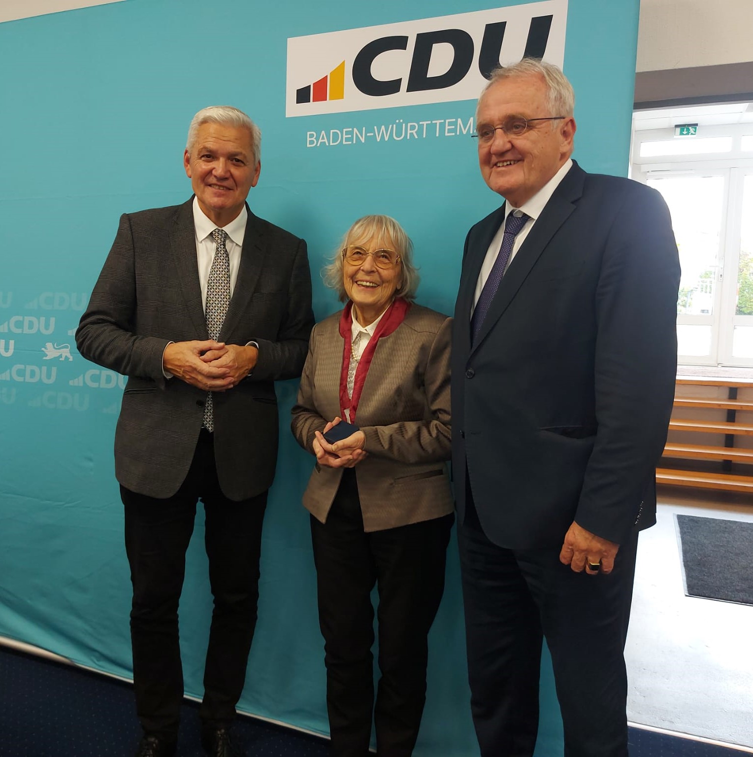 Die mit der Konrad-Adenauer-Medaille geehrte Ursula Kuri, umrahmt von Hubert Hüppe (li.) und Rainer Wieland (re.)