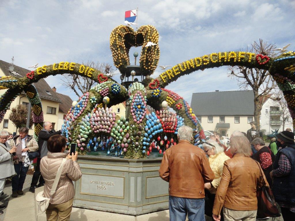 Nach dem Mittagessen Spaziergang zum Osterbrunnen in Schechingen. Tausende Eier schmücken den Marktbrunnen in der kleinen Gemeinde. Darauf befinden sich dieses Jahr 13397 Eier, davon 21 Straußen-, 2051 Gänseeier und ca. 200 Wachteleier, handbemalt mit unterschiedlichen Motiven. Ehrenamtliche Helferinnen und Helfer gestalten den Osterbrunnen und verbringen hunderte von Stunden zur Vorbereitung mit malen, grundieren, binden sowie  Aufbau.  Bewirtung mit selbstgebackenem Kuchen nach Hausfrauenart und Kaffee.